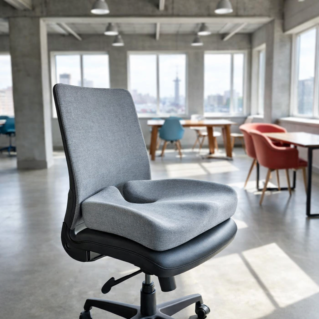 A modern ergonomic office chair with a contoured memory foam seat cushion, designed to provide enhanced comfort and support during long hours of sitting. Perfect for offices or home workspaces, it helps improve posture and reduce pressure on the lower back and tailbone.